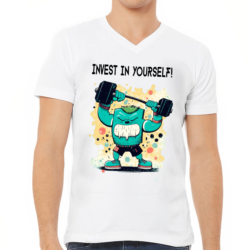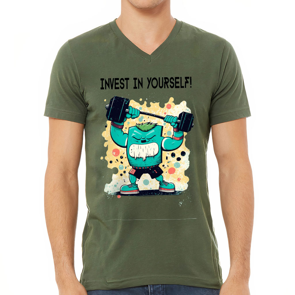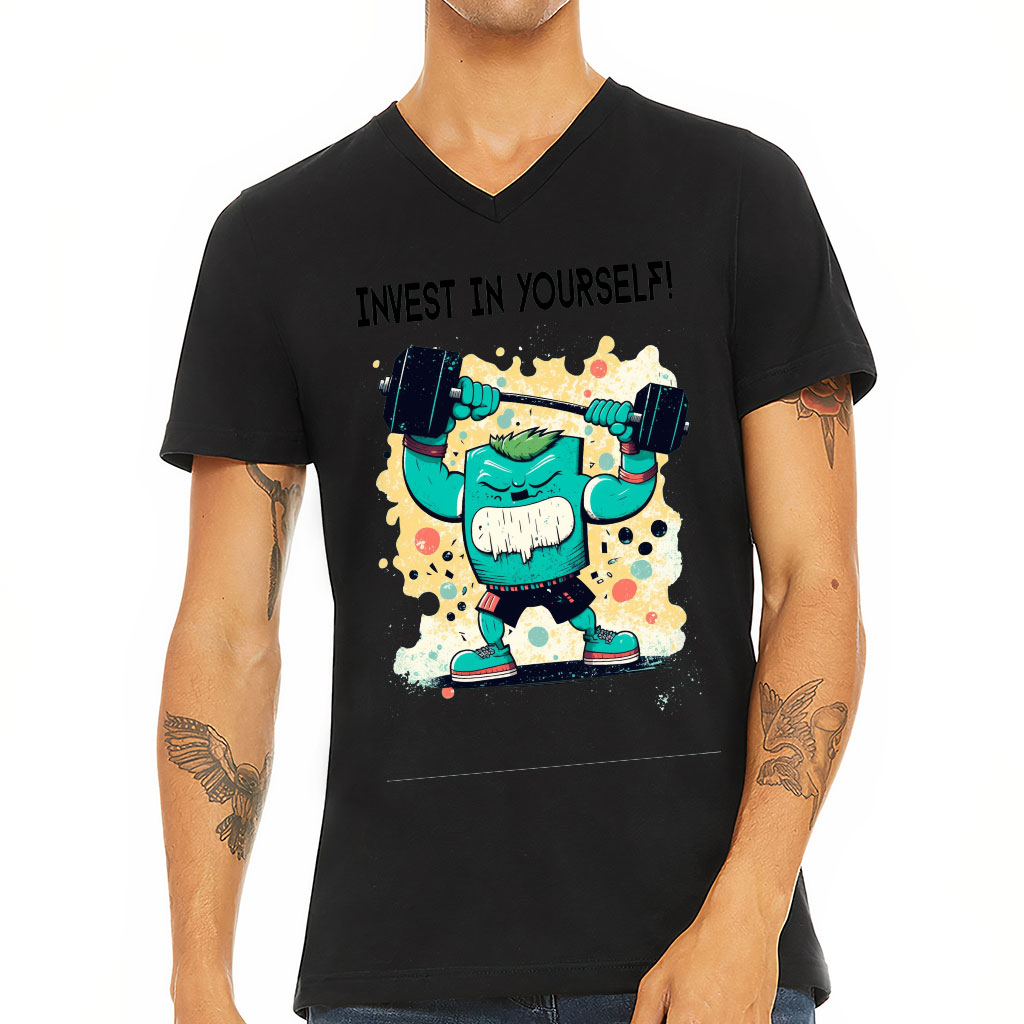 Invest in Yourself V-Neck T-Shirt is proudly made with 7x less water than average manufacturers, in recycle-friendly facilities that also guarantee zero sweatshop conditions.