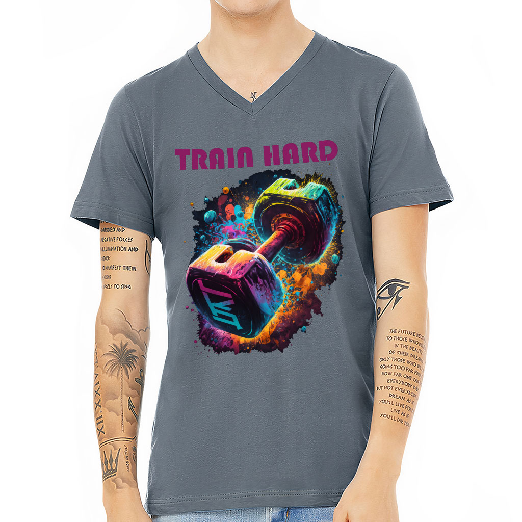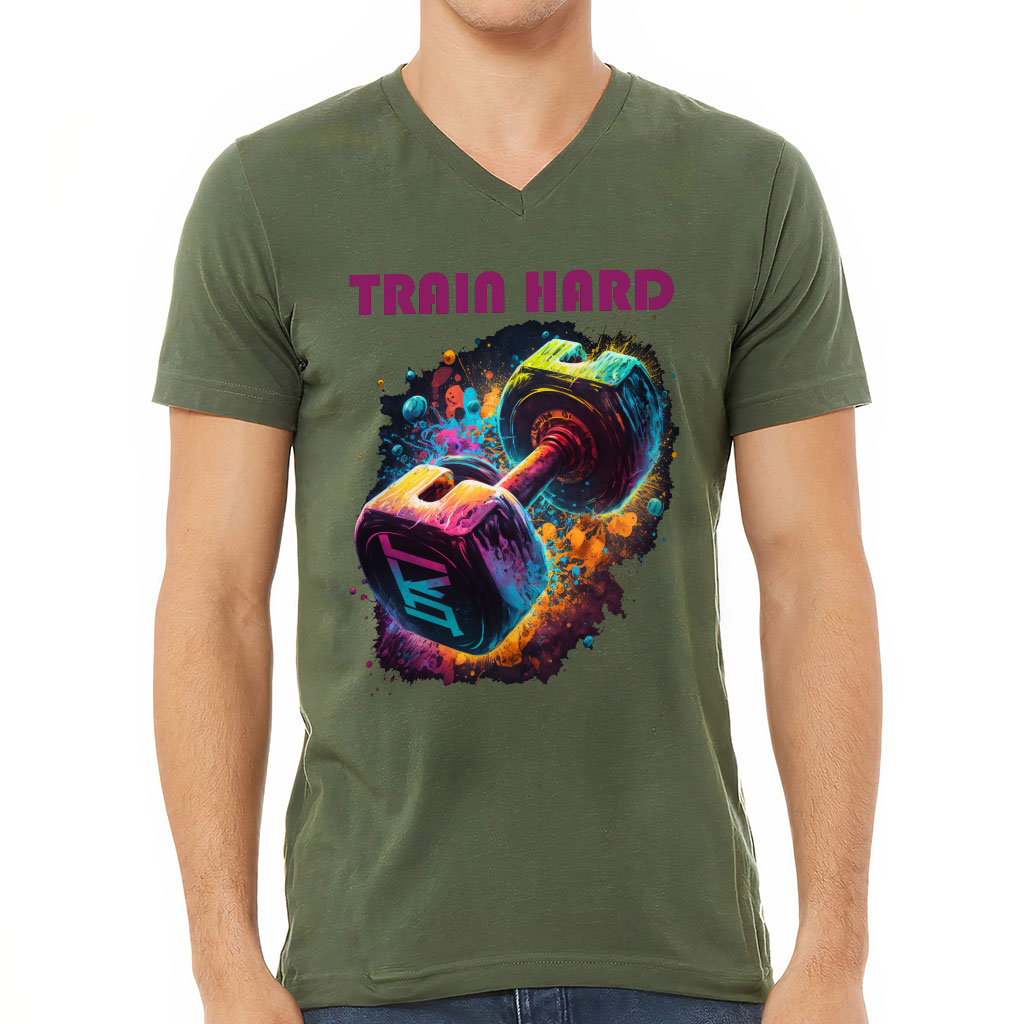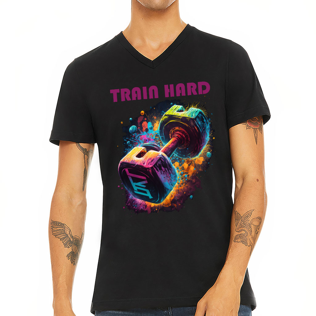 Train Hard V-Neck T-Shirt – Dumbbell T-Shirt – Cool V-Neck Tee
